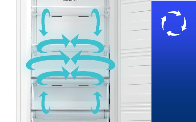 Sistem Multi Air Flow Acest sistem are grija ca aerul rece sa se extinda rapid si uniform, mai eficient decat sistemul traditional de ventilare, pentru ca alimentele sa ramana proaspete timp indelungat. |