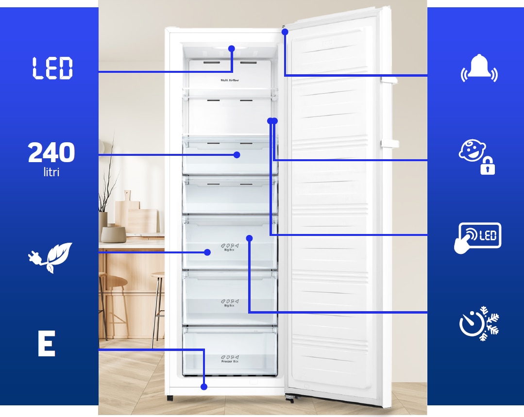 Iluminare LED Blocare acces copii Congelare rapida Control electronic Usa reversibila ECO