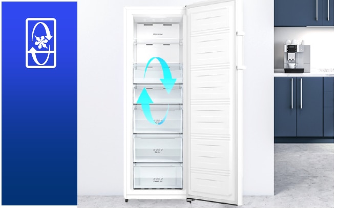 InverterSistem de racire Full No Frost Uita de dezghetarea congelatorului! Tehnologia Full No Frost asigura circulatia constanta a unui aer rece, lipsit de umiditate, astfel gheata nu se poate forma, iar alimentele raman proaspete mai mult timp. |