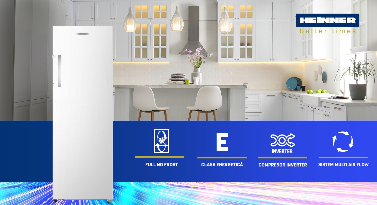 Congelator Heinner HFF-HS240NFE++, 240 l, No frost, 5 sertare + 2 compartimente cu rafturi sticla, Sistem Multi Air-Flow, Control electronic, Clasa E, H 172 cm, Alb