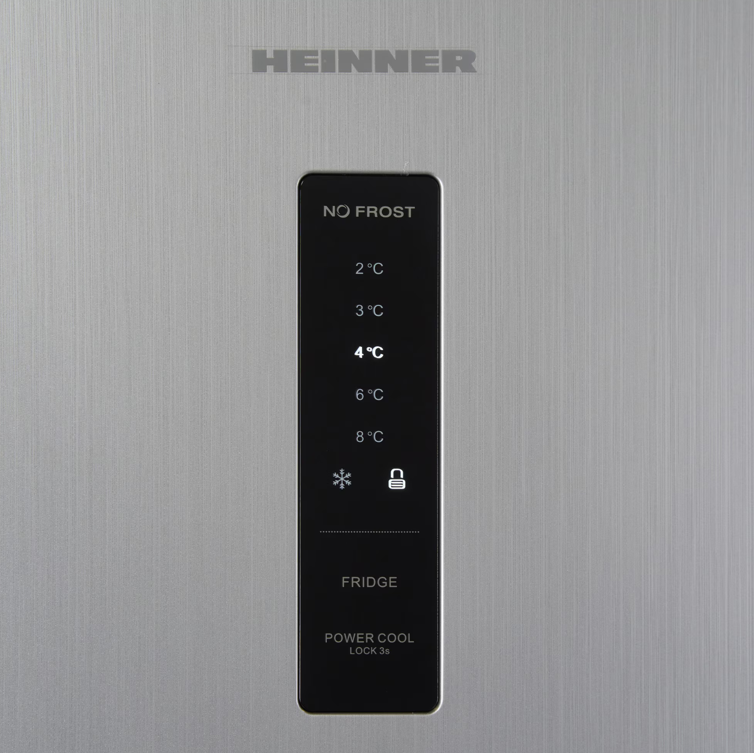 Frigider cu doua usi Heinner HF-HM415NFSE++, 415 l, Full No Frost, Clasa E, Compresor Dual Inverter, Display, Blocare Acces copii, H 178 cm, Argintiu
