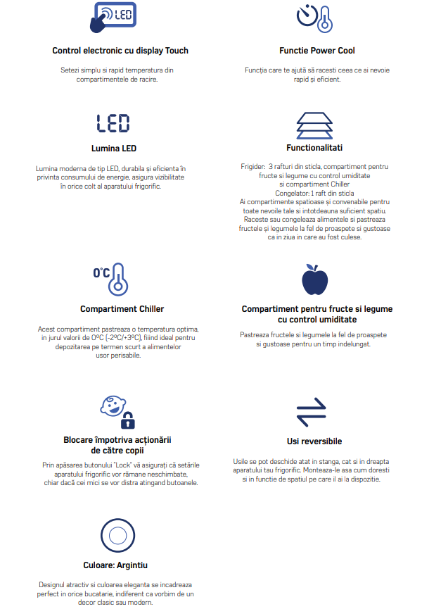 Caracteristici generale Caracteristici generale Detalii frigider Detalii congelator Caracteristici cheie Energie & Performanta Dimensiuni
