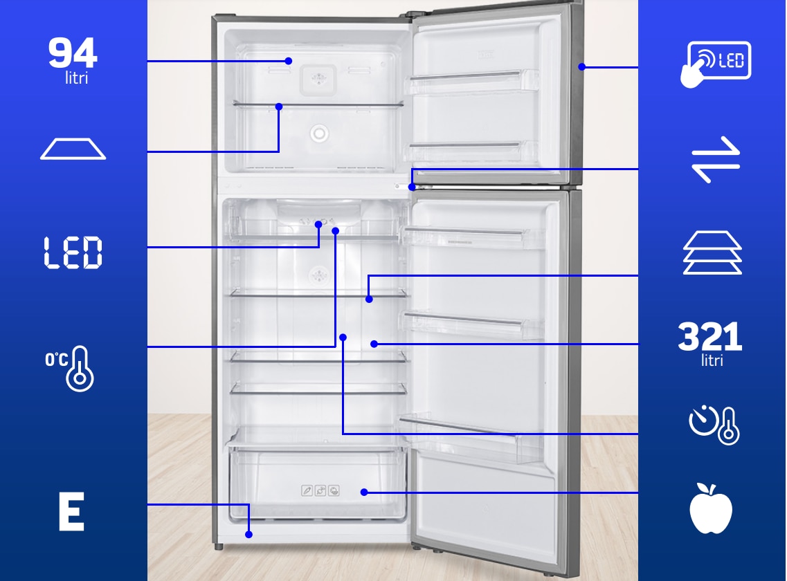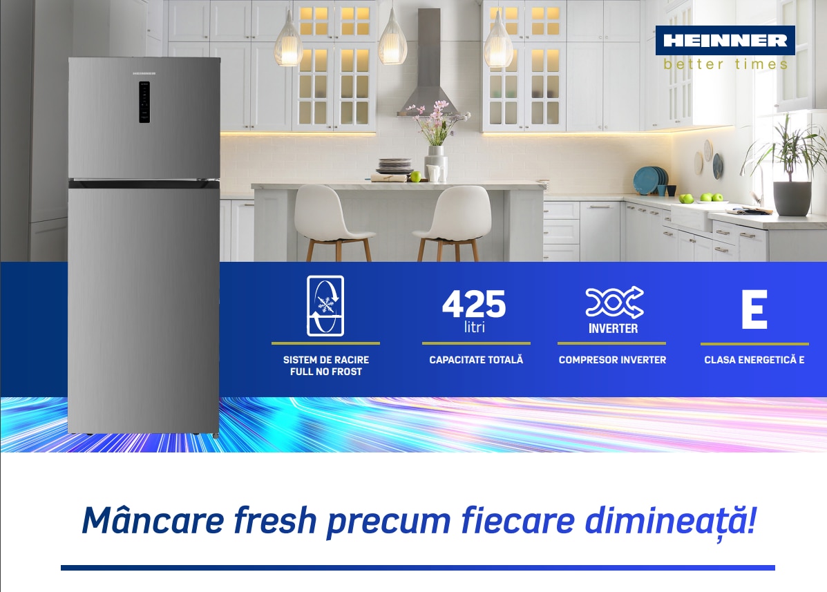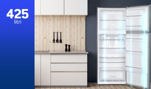 Capacitate totala 425L Spatiul chiar nu mai este o problema, uita de inghesuiala si de chinul de a aranja alimentele. Un spatiu epic, care iti asigura o vedere de ansamblu a ceea ce ai in frigider si congelator. |