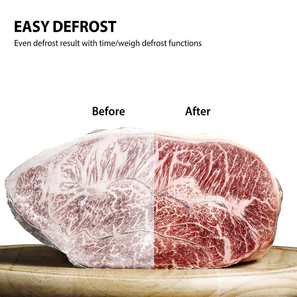 Dezghetarea este fara efort cu functiile de dezghetare pe baza de timp si greutate. Aceste optiuni inteligente asigura o defrostare uniforma si eficienta, permitandu-va sa adaptati bazat pe specificatiile alimentelor dumneavoastra. Indiferent de cantitate sau tip, veti obtine rezultate perfecte de fiecare data, economisind timp si obtinand un preparat gata pentru gatit.