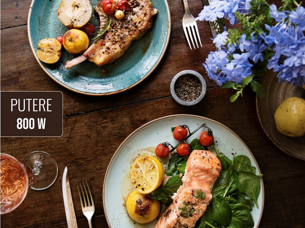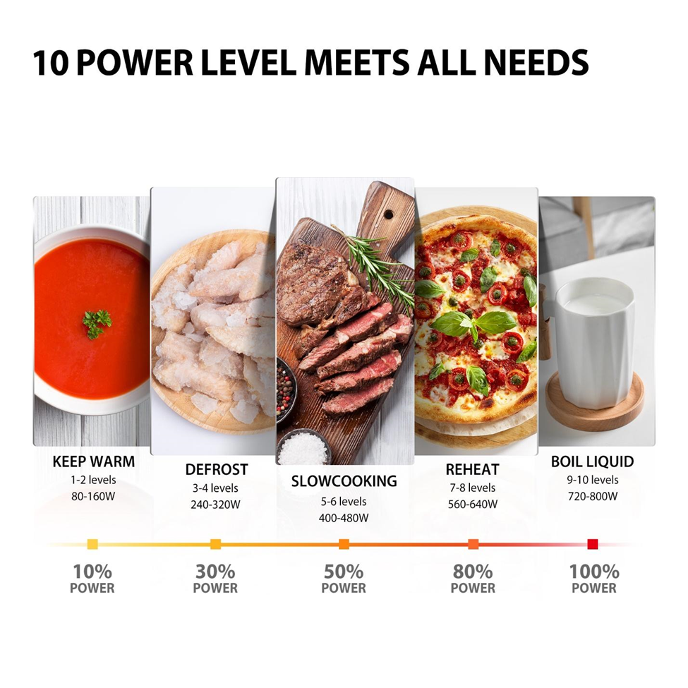 Personalizati fiecare reteta cu cele 10 nivele de putere variabile, de la 80W la 800W. Aceasta gama larga de optiuni va permite sa adaptati puterea exacta la nevoile culinare, fie ca vreti sa pastrati mancarea calda, fie ca gatiti rapid si intens. Beneficiati de control total asupra prepararii alimentelor, asigurand rezultate perfecte de fiecare data.