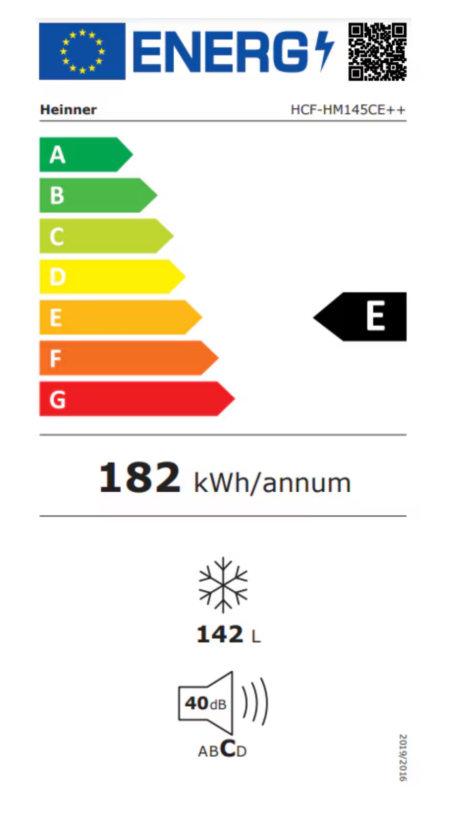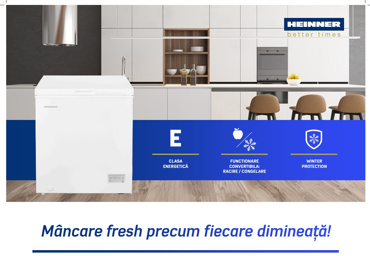 Lada frigorifica Heinner HCF-HM145CE++, 142 l, Clasa E, Convertibila Frigider/Congelator, Control electronic, Alb