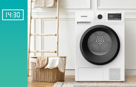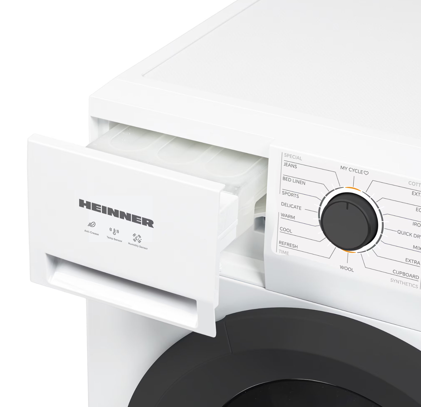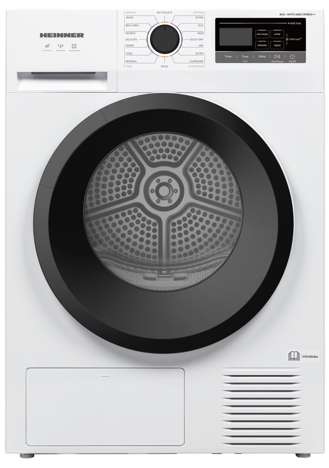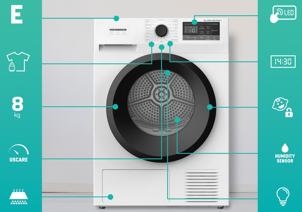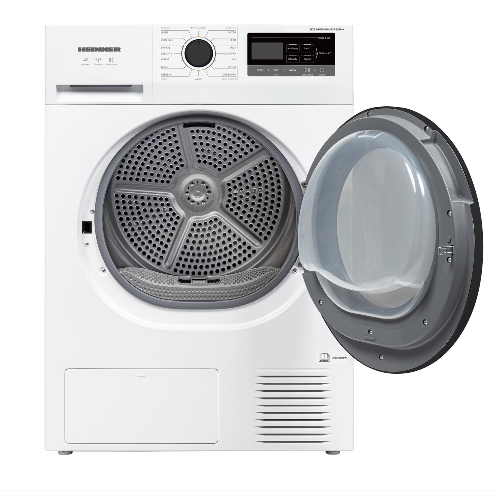 Uscator de rufe Heinner HHPD-M8N13PBKE++, Pompa de caldura, 8 kg, 16 programe, Clasa E, Display LED, Functie anti-sifonare, Lumina cuva, Indicator curatare filtru scame, Indicator rezervor colectare apa plin, Blocare acces copii, Alb
