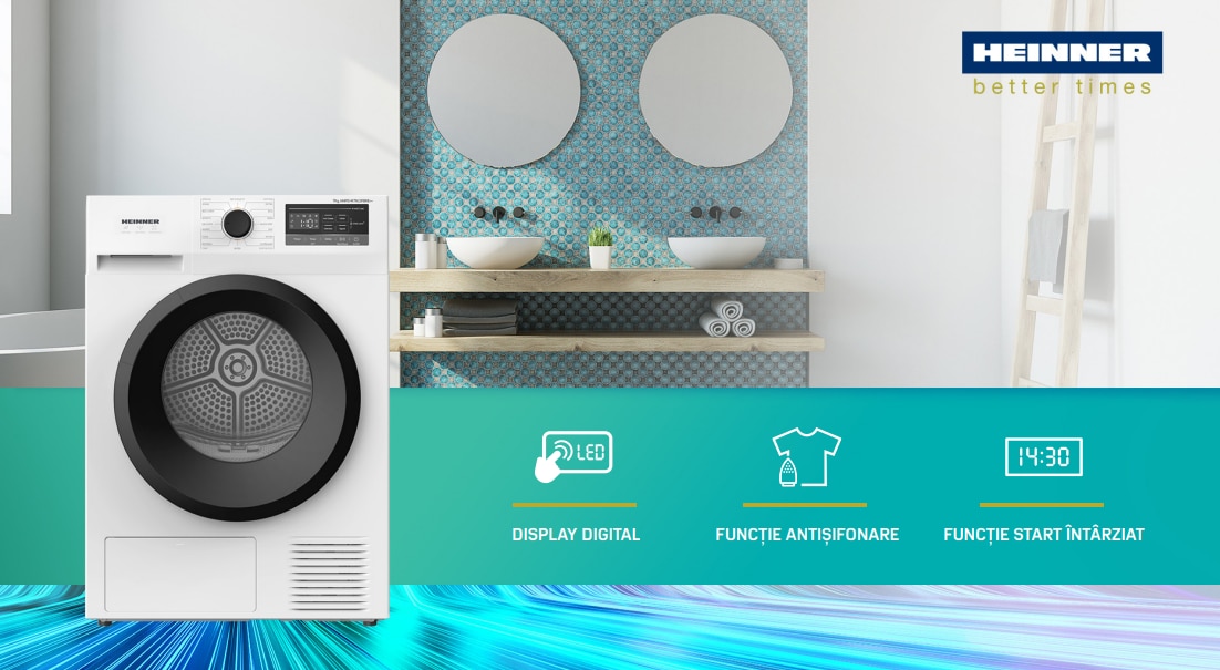 Uscator de rufe Heinner HHPD-M8N13PBKE++, Pompa de caldura, 8 kg, 16 programe, Clasa E, Display LED, Functie anti-sifonare, Lumina cuva, Indicator curatare filtru scame, Indicator rezervor colectare a