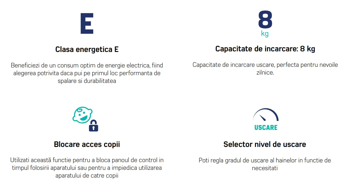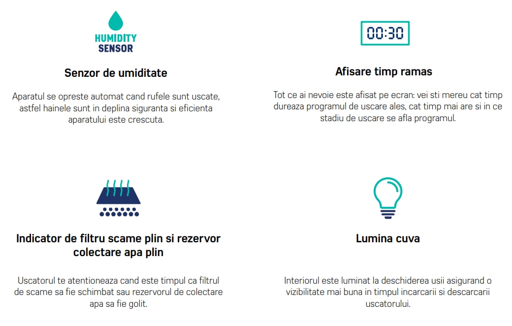 Ajustare nivel uscare Afisare timp ramas Functie anti-sifonare Blocare acces copii Indicator curatare filtru scame Indicator rezervor colectare apa plin Iluminare cuva
