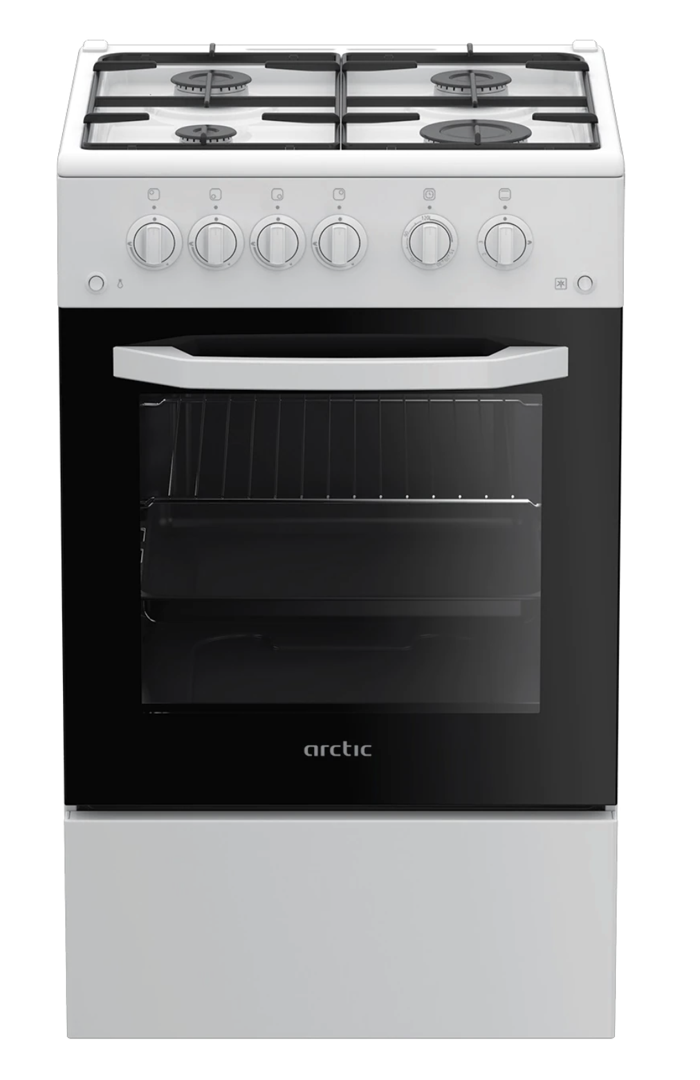 Aragaz Arctic AGM5511DTTL, 4 arzatoare, Gaz, Aprindere electrica plita/cuptor, Safety Plus, Grill, Timer, Arzatoare cu eficienta ridicata, 50 cm, Alb