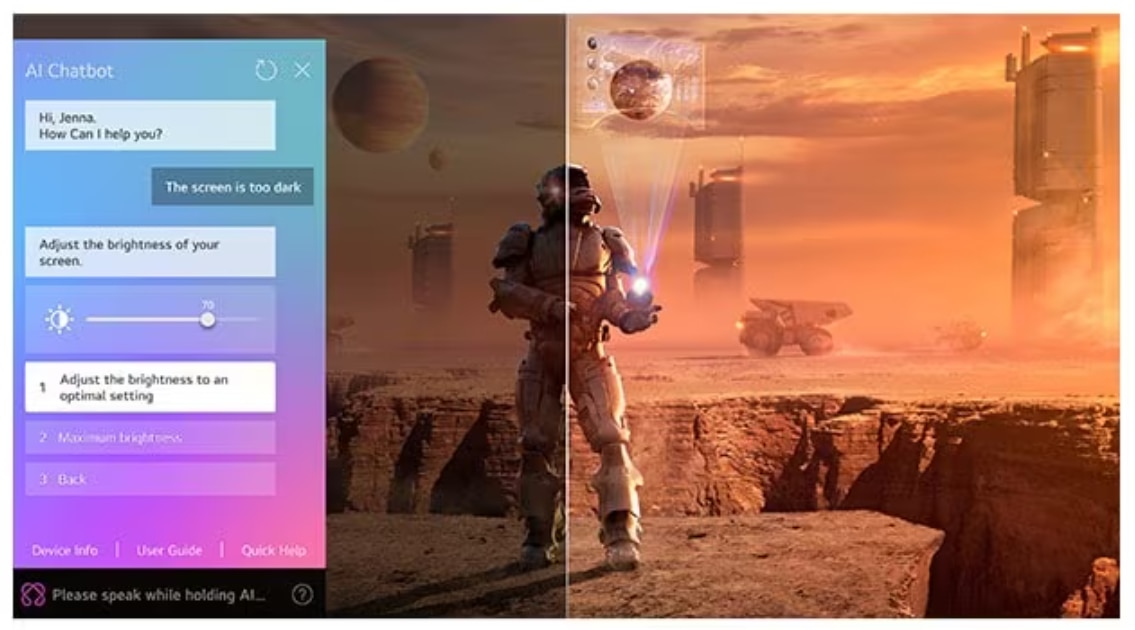 Ai propriul AI Chatbot care rezolva activ probleme si care te ajuta cu solicitarile. Pur si simpu vorbeste televizorului, deoarece iti poate clasifica intentiile si poate raspunde in consecinta.
